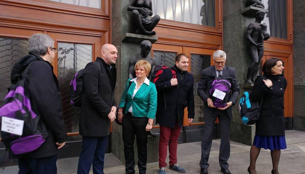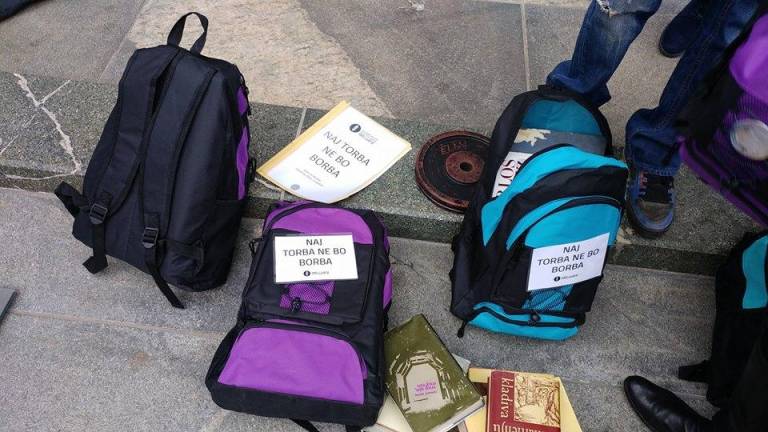 Člani Društva IndiJanez so danes pred državnim zborom poslancem in poslankam na ramena naložili šolske torbe, ki jih vsak dan nosijo naši osnovnošolci.