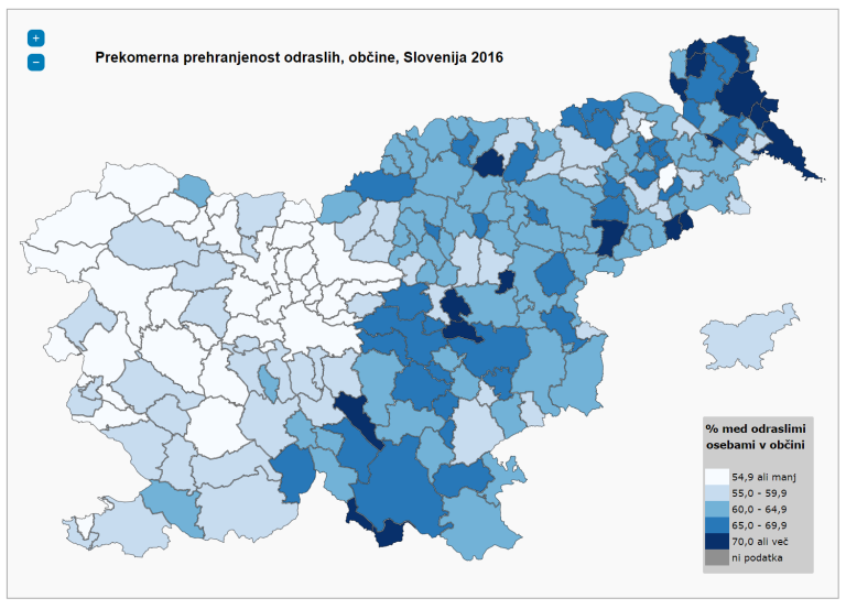 Po podatkih Nacionalnega inštituta za javno zdravje delež odraslih s prekomerno telesno težo najvišji v Mestni občini Maribor znaša 58,4 odstotka, v Mestni občini Ptuj pa 59,3 odstotka.