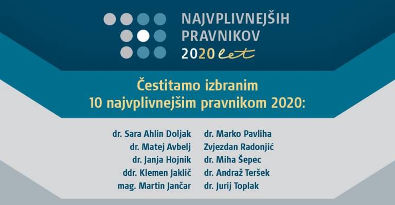 Na osrednjem slovenskem pravnem portalu IUS-INFO se je končal jubilejni, že 20. izbor deset najvplivnejših pravnikov, ki tradicionalno poteka v dveh delih. Izmed dvajsetih finalistov se je med najvplivnejše uvrstilo deset pravnikov, ki so do 17. novembra, ko se je izbor končal, dobili največ glasov.