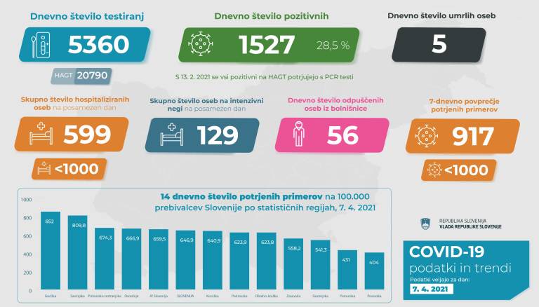 V Sloveniji so včeraj, 7. aprila, opravili 5360 PCR testiranj na koronavirus in potrdili 1527 novih okužb, gre za 28,5-odstotni delež okužb.