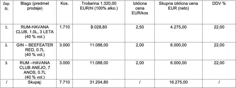 Finančna uprava Republike Slovenije bo na dražbi prodajala več tisoč litrov ruma in gina.