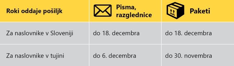 Na Pošti Slovenije uporabnikom svetujejo, da pisma in pakete za naslovnike v Sloveniji pošljejo vsaj do 18. decembra, v tujini za pisma do 6. decembra, za pakete pa do 2. decembra. Če tega ne bodo storili pravočasno, lahko za pisemske pošiljke za tujino še vedno uporabijo storitev Prednostno, na voljo jim je tudi hitra pošta po Sloveniji in v tujini.