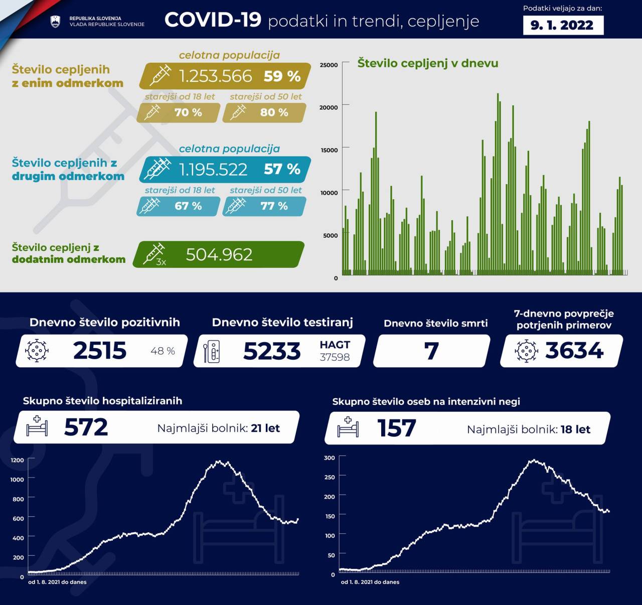 V Sloveniji so včeraj, 9. januarja, opravili 5233 PCR testiranj na koronavirus in potrdili 2515 novih okužb, gre za 48-odstotni delež okužb.