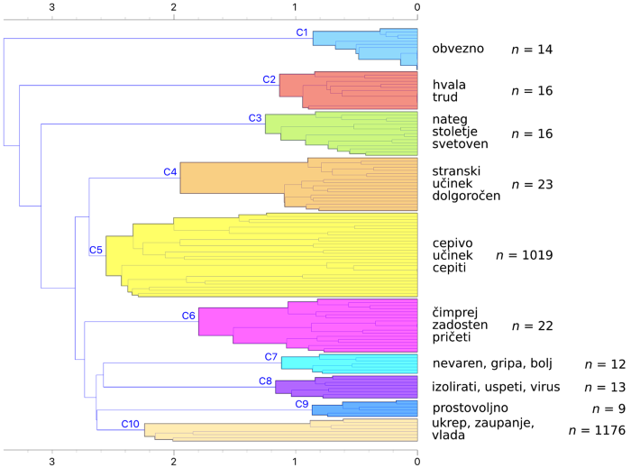 Največji sta deseta skupina, ki vsebuje komentarje o vladnih ukrepih in vključuje veliko skeptikov, ter peta skupina, ki obravnava vprašanja varnosti cepiva za rizične skupine ter skrb za stranske učinke in vključuje tako tiste, ki se nameravajo, kot tiste, ki se ne nameravajo cepiti.