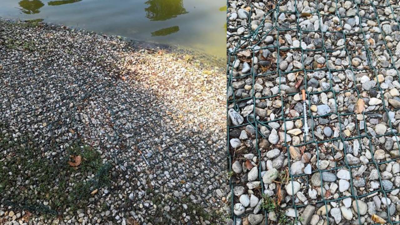 Park sredi mesta ostaja zbirališče narkomanov. Bralec je naletel na odvržene injekcijske igle pri ribniku.