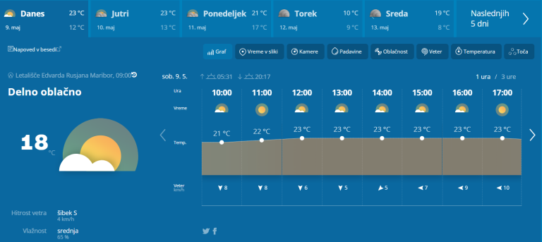 Danes bo večinoma sončno, občasno bo ponekod nekaj več oblačnosti. Čez dan bo spet zapihal jugozahodni veter, v Prekmurju in deloma na Štajerskem pa jugovzhodnik. Najvišje dnevne temperature bodo od 22 do 26 °C.