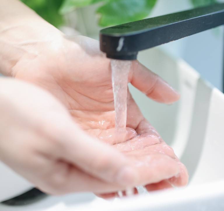 - Temeljito si operite roke s toplo vodo in tekočim milom ter uporabite papirnate brisače za temeljito sušenje rok in osušene roke še razkužite.