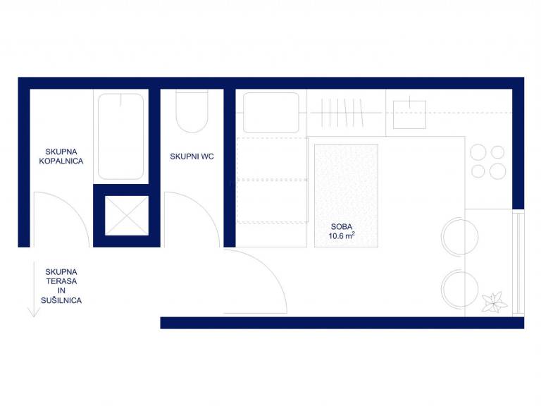 Soba je velikosti 12,6 kvadratnih metrov, v njej pa je poleg postelje tudi lastna kuhinja. Toaletne prostore si deli še z eno sobo. Sobi pripada tudi shramba v kleti v velikosti dva kvadratna metra ter souporaba velike skupne terase in sušilnice, je navedeno v oglasu na portalu Nepremicnine.net.