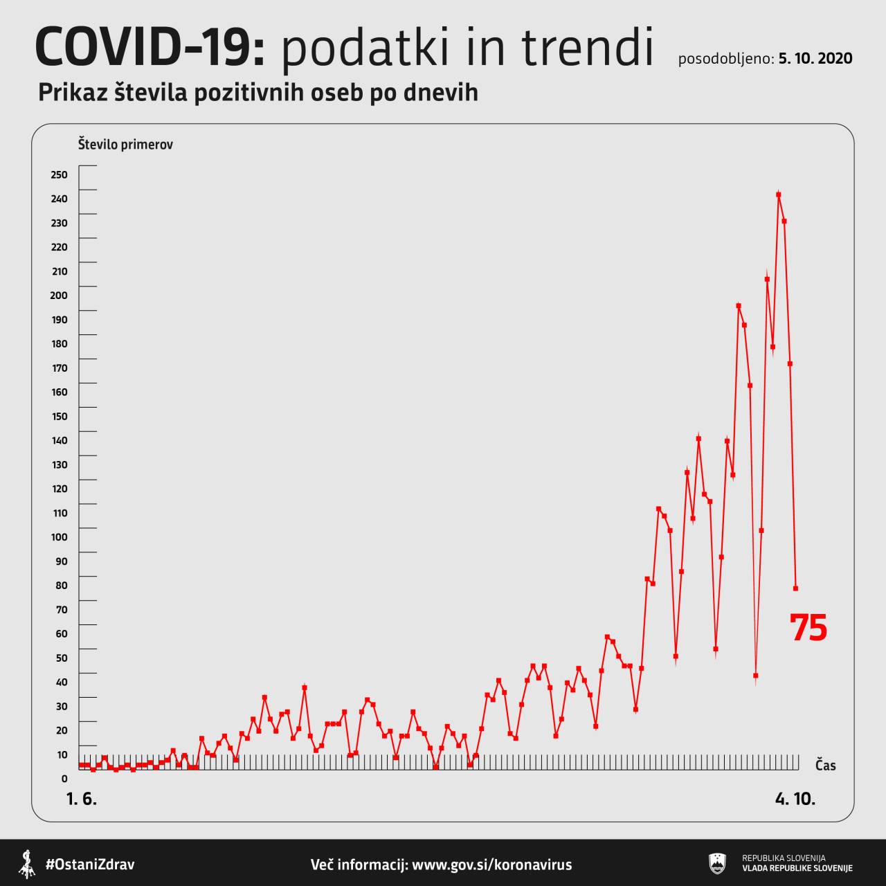 V Sloveniji so včeraj, 4. oktobra 2020, opravili 1034 testiranj na koronavirus. Potrdili so 75 novih okužb. Za primerjavo. Dan prej so ob 1940 testiranjih potrdili 168 novih okužb.