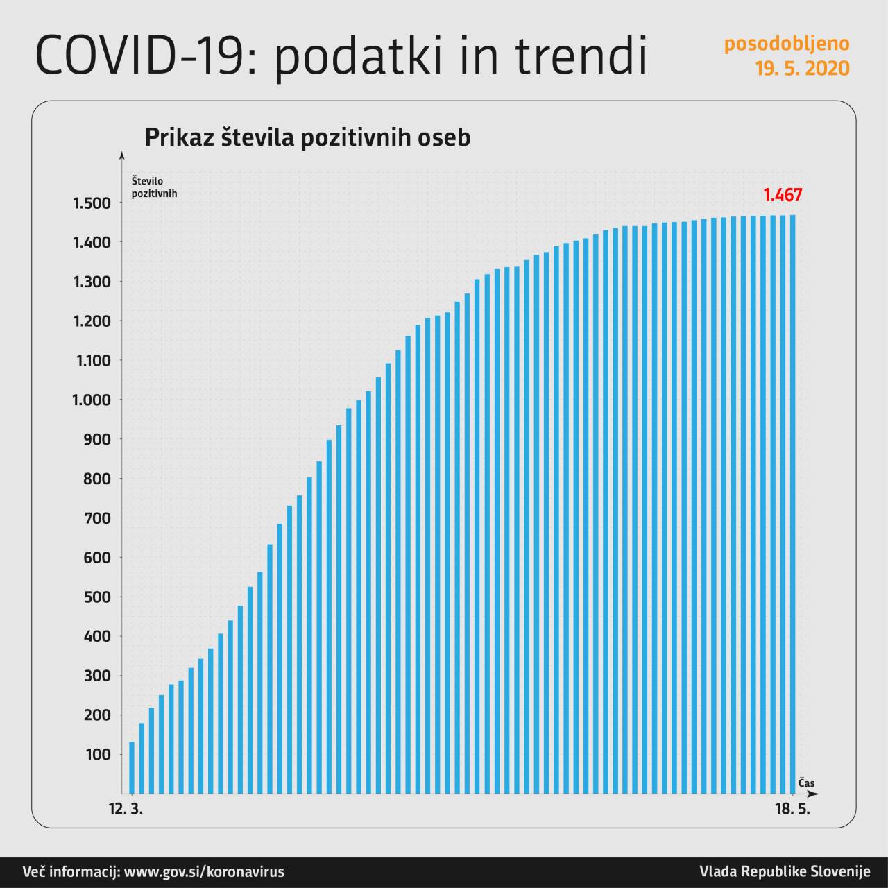 Po zadnjih podatkih, ki jih je sporočil državni vrh, je bilo včeraj v štirindvajsetih urah opravljenih 1128 testiranj, od tega je bila ena oseba pozitivna na koronavirus. Doslej smo v Sloveniji zabeležili 1467 primerov koronavirusa.