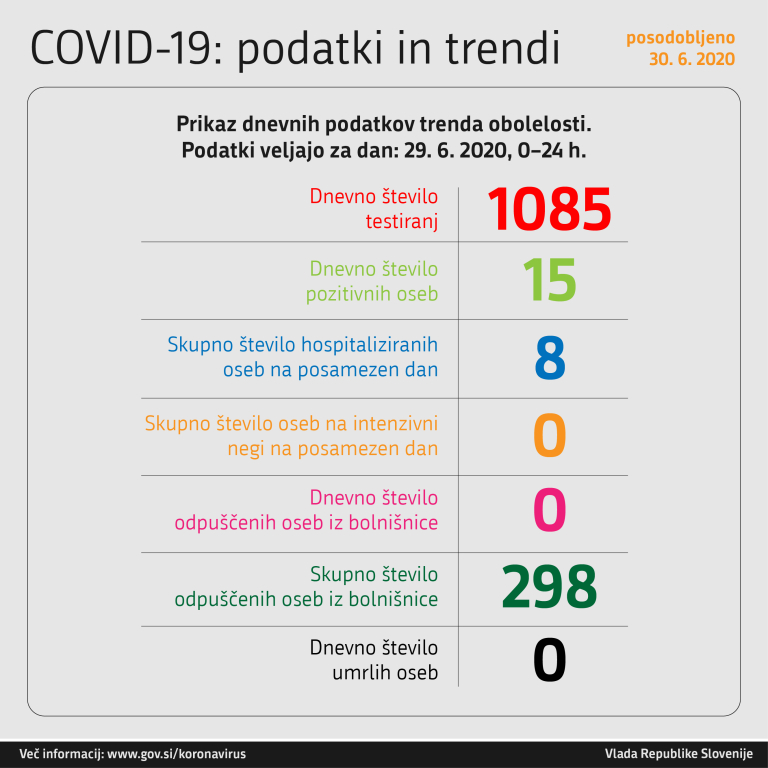 Včeraj, 29. junija, so v Sloveniji opravili 1085 testiranj, od tega je bilo odkritih 15 novih okužb s koronavirusom.
