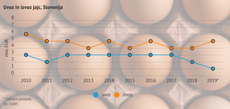 Jajc vsako leto več izvozimo kot uvozimo. Lani smo jih tako izvozili za 4,6 milijona evrov, uvozili pa za 1,3 milijona evrov. Največ jajc izvozimo na Hrvaško, uvozimo pa jih največ iz Litve.