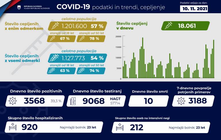 V Sloveniji so včeraj, 10. novembra, opravili 9068 PCR testiranj na koronavirus in potrdili 3568 novih okužb, gre za 39,3-odstotni delež okužb.