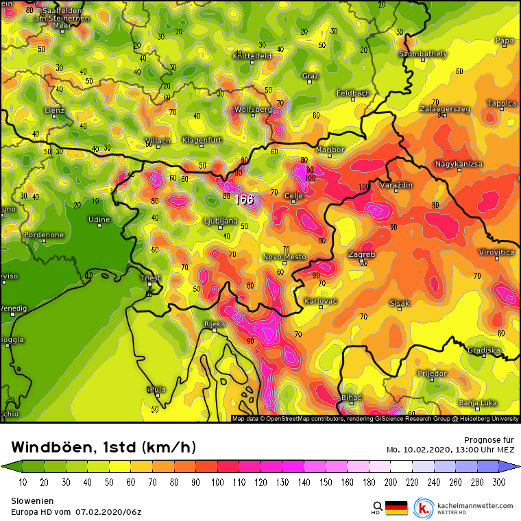 »Trenutni izračuni numeričnih meteoroloških modelov kažejo na to, da bo veter v sunkih, na izpostavljenih mestih, v delu Podravja, Haloz in Prlekije, v ponedeljek čez dan dosegal hitrosti okoli 100 kilometro na uro! Po vrhovih Pohorja, območja Menine planine in po še nekaterih višje ležečih predelih bi lahko jugozahodni veter v sunkih presegel hitrost 140 kilometrov na uro. Glede na trenutne izračune je lokalno možen tudi obsežnejši vetrolom,« so zapisali na portalu Neurje.si.