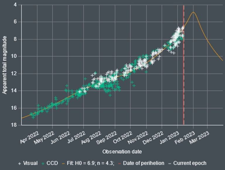 Komet je na temni lokaciji že viden s prostimi očmi: »Njegov sij je že v novembru 2022 dosegel 10. magnitudo, trenutno pa na spletni strani COBS že poročajo, da je sij dosegel 5,3 magnitude, kar pomeni, da je na temni lokaciji viden s prostimi očmi.«