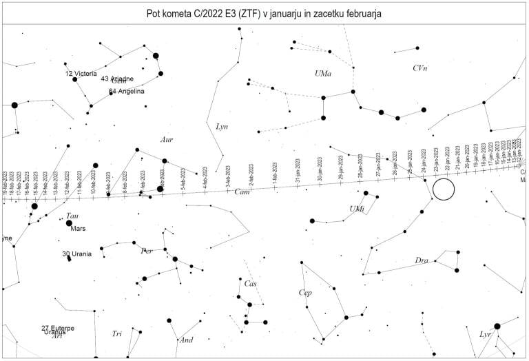 Komet se bo med 30. in 31. januarjem 2023 gibal okoli deset stopinj vstran od Severnice, 6. februarja bo letel okoli dve stopinji vstran od Kapele, najsvetlejše zvezde v ozvezdju Voznika, 11. februarja pa bo letel eno stopinjo vstran od Marsa.