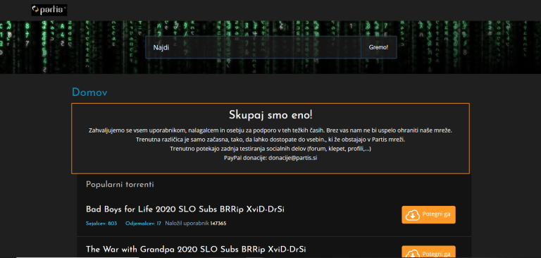 Slovenski spletni portal Partis.si za izmenjavo datotek s pomočjo protokola BitTorrent je ponovno dostopen.