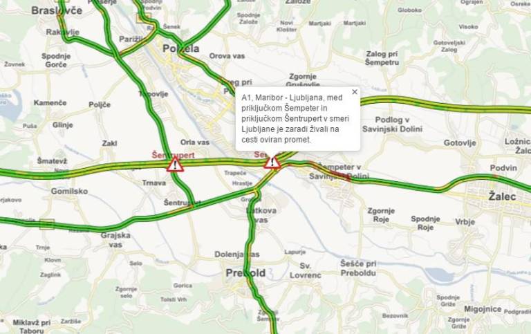 Prav tako pa na štajerski avtocesti pes na vozišču ovira promet med Šempetrom in Šentrupertom. Opozorilo velja za obe smeri, tako proti Mariboru kot proti Ljubljani.