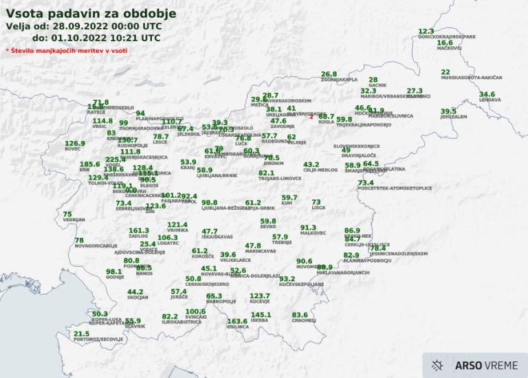Najmanj padavin smo namerili na skrajnem severovzhodu države in ob obali, kjer jih je zapadlo okoli 20 litrov. Največ smo jih znova namerili na jugu države v Osilnici, v zgornjem Posočju in Na voglu, kjer je zapadlo več kot 220 litrov dežja.