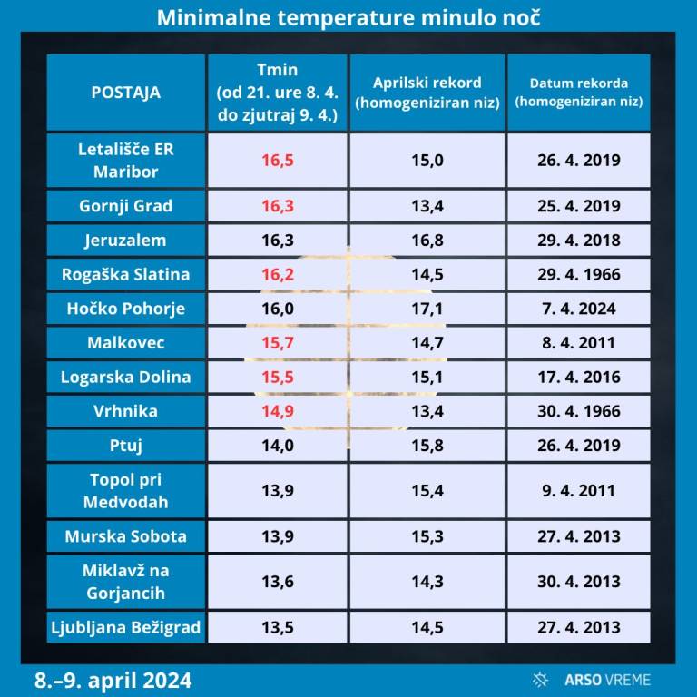 Minimalne temperature se ponekod niso spustile pod 15 stopinj Celzija. Na mariborskem letališču so namerili 16,5 stopinj Celzija.