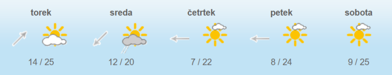 Najvišje dnevne temperature bodo od 21 do 27 stopinj Celzija.