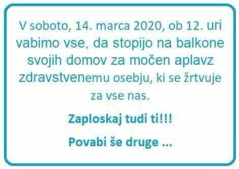 Objava na spletu poziva, da stopimo na balkone ter se z bučnim aplavzom poklonimo zdravstvenemu osebju, ki se žrtvuje za nas.