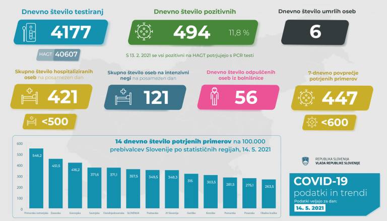 V Sloveniji so včeraj, 14. maja, opravili 4177 PCR testiranj na koronavirus in potrdili 497 novih okužb, gre za 11,8-odstotni delež okužb. Opravljenih je bilo tudi 40.607 hitrih antigenskih testov, pri čemer pa ni znano, koliko od teh je bilo pozitivnih, saj se od 13. februarja vsi pozitivni na hitrih testih potrjujejo s PCR testi.