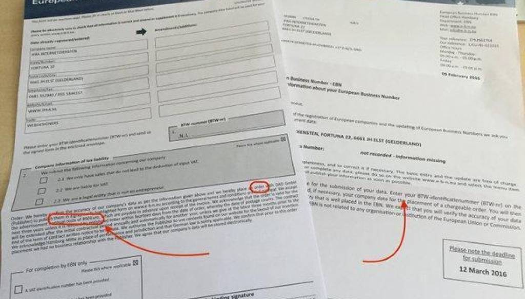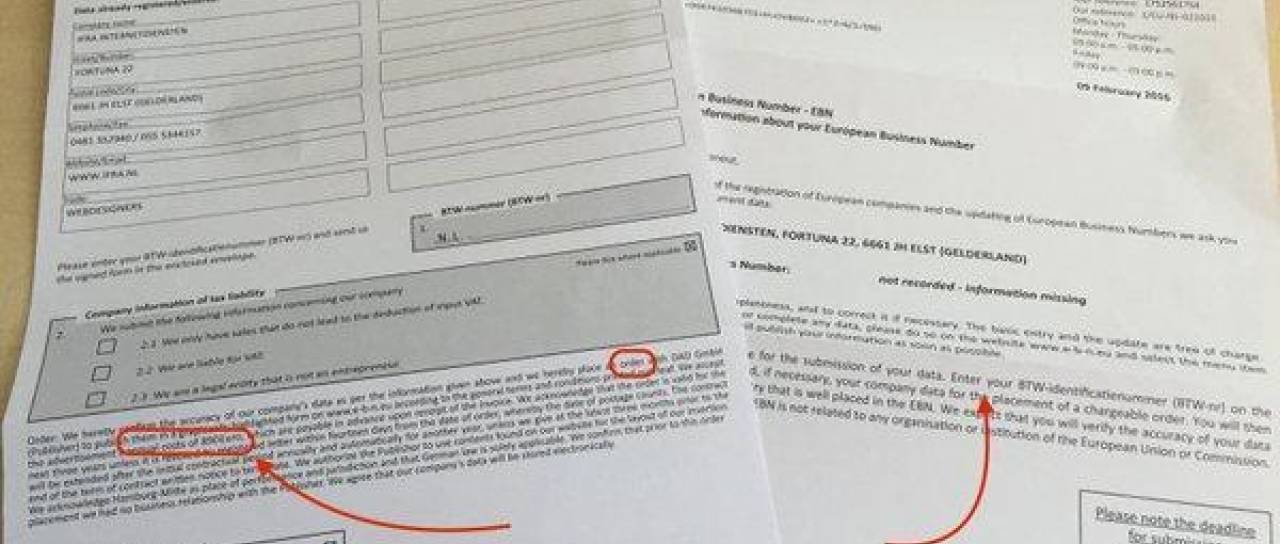 Mnogo slovenskih podjetnikov je ta teden prejelo pismo tujega poslovnega imenika European Business Number, ki vabi, da s svojimi podatki izpolnijo formular z vsemi podatki. Podjetnika na spleni strani poslovnega imenika prepričujejo, da bo ob prijavi prejel tudi evropsko številko podjetja, ki naj bi bila nujno potrebna, če želi prodreti na evropski trg. Mnogi pa žal velikokrat ne berejo drobnega tiska, v katerem je navedeno, da je potrebno za storitev oglaševanja plačati kar 677 evrov letno in da se bo denar odtegoval še v naslednjih treh letih.