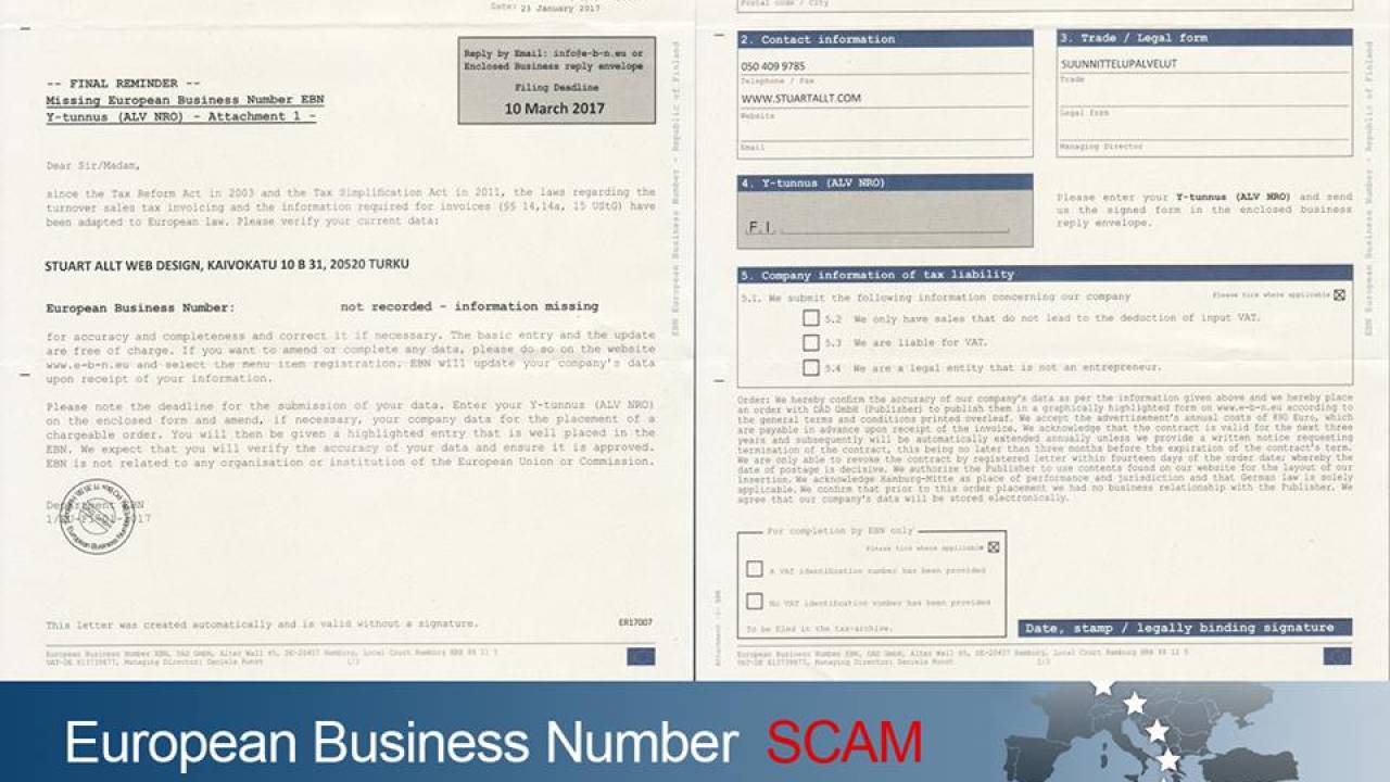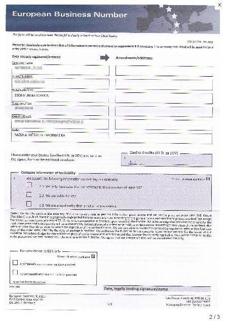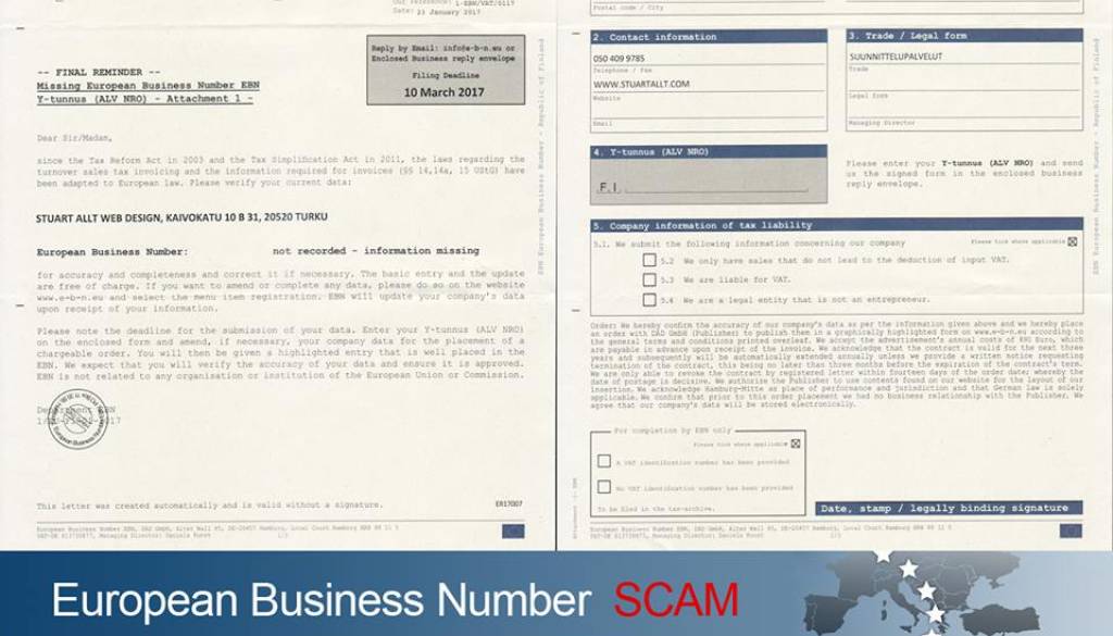 Spletni imenik European Business Number potencialnim žrtvam pošlje dopis, v katerem jih poziva k dopolnitvi manjkajočih podatkov o podjetju, predvsem davčne številke. Številne žrtve pismu, ki izgleda prepričljivo, formalno in uradno, nasede ter pošlje dopolnjene podatke o svojem podjetju oziroma obrti.