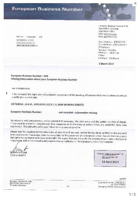 Številna podjetja in obrtniki v Pomurju in Sloveniji so te dni zopet prejeli zavajajočo pošto poslovnega imenika European Business Number, ki vabi podjetnike in obrtnike k vpisu v takozvani evropski poslovni spletni imenik. Podjetnik je zaveden, da se prijavlja v brezplačno bazo, kjer bo pridobil številko, ki je nujna za podjetja v EU, vendar drobni tisk pod obrazcem razkriva, da gre za storitev, ki je plačljiva.