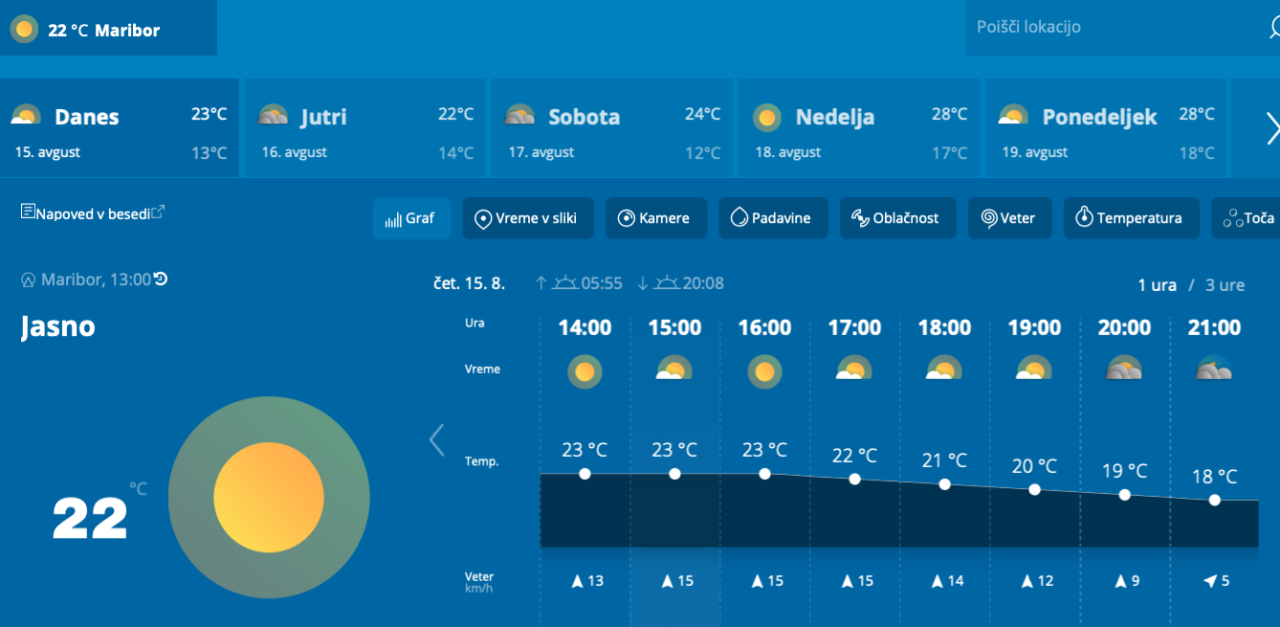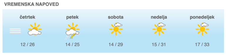 Podobno vreme lahko pričakujemo tudi jutri. Prebudili se bomo v jutro s temperaturami od 10 do 15, ob morju 17 stopinj Celzija. V dopoldanskih urah se bo delno zjasnilo, popoldne pa bo prihajalo do posameznih ploh, lahko se pojavi tudi kakšna nevihta. Najvišje dnevne temperature bodo od 22 do 25, na Primorskem do 29 stopinj Celzija.