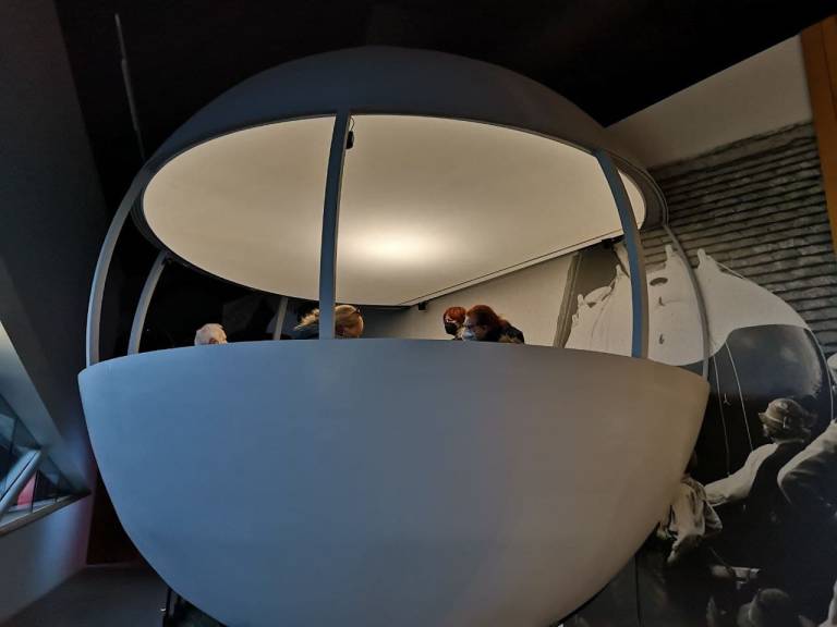 V prvi sobi Expana nas pričakala okrogla komora, na klopi pa VR očala. Očala smo si nadeli in balon je poletel! Skozi izkušnjo so nas vodila očala in glas zaposlene, ki je predstavljal destinacije našega balona.