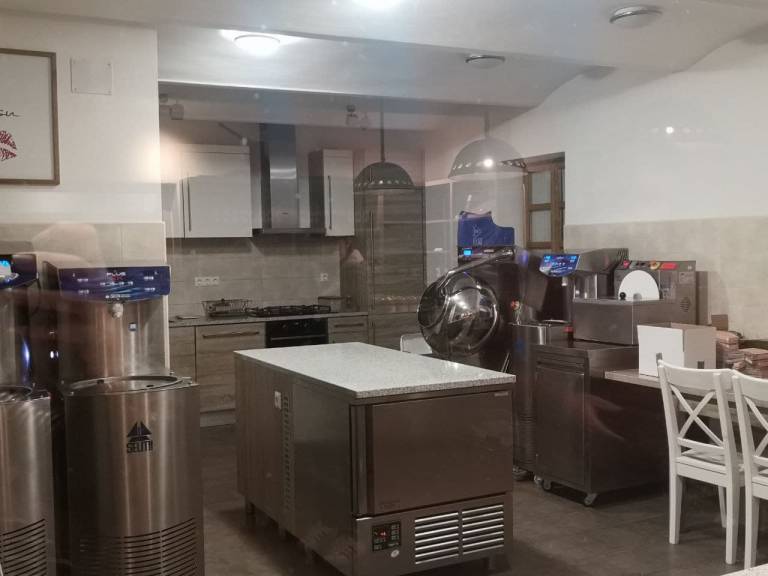 Iz trgovinice se pogled razširi še v industrijsko kuhinjo, kjer nastajajo sladke pregrehe.
