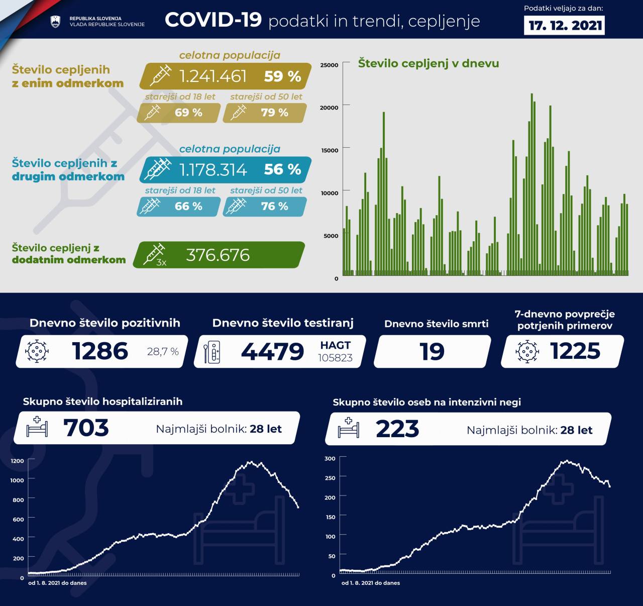 V Sloveniji so včeraj, 17. decembra, opravili 4479 PCR testiranj na koronavirus in potrdili 1286 novih okužb, gre za 28,7-odstotni delež okužb.