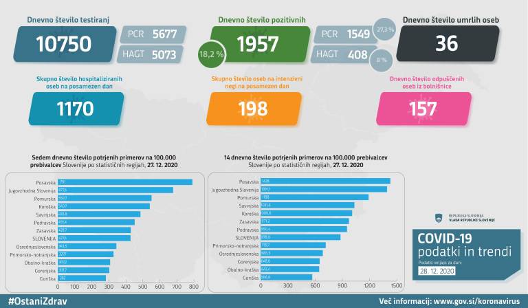 V Sloveniji so včeraj, 28. decembra, opravili 10.750 testiranj na koronavirus in potrdili 1957 novih okužb. To pomeni, da je bil delež pozitivnih testov tokrat 18,2-odstoten.
