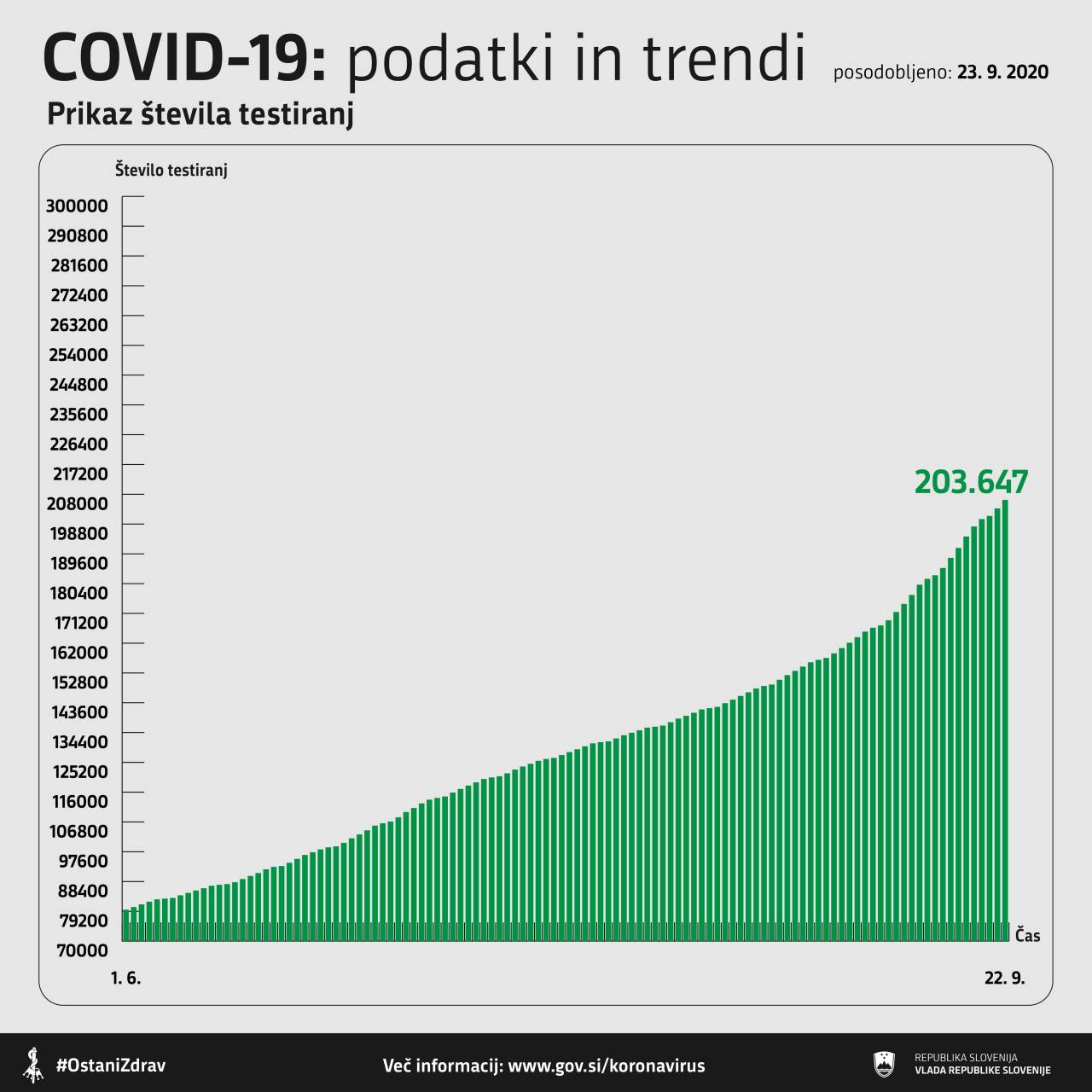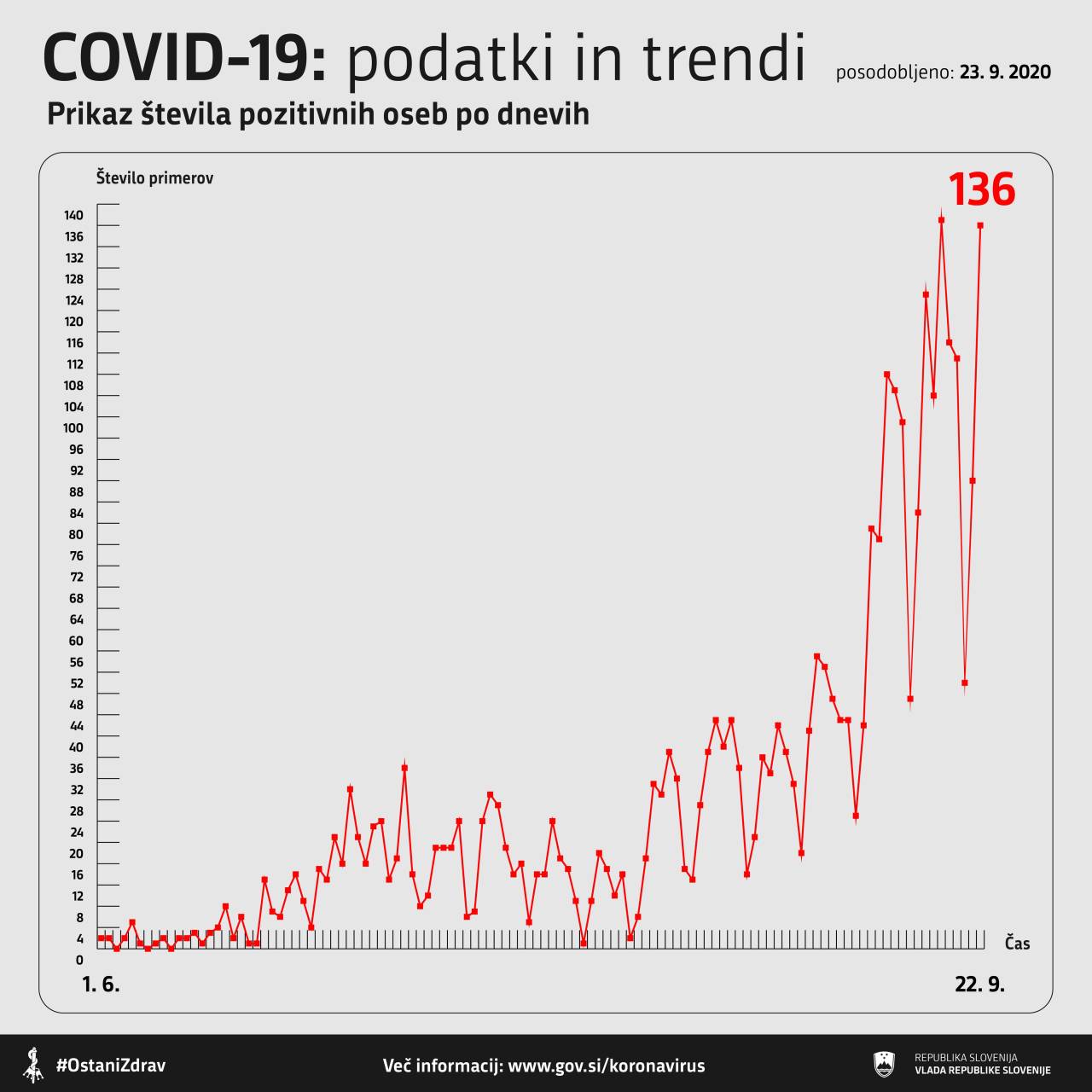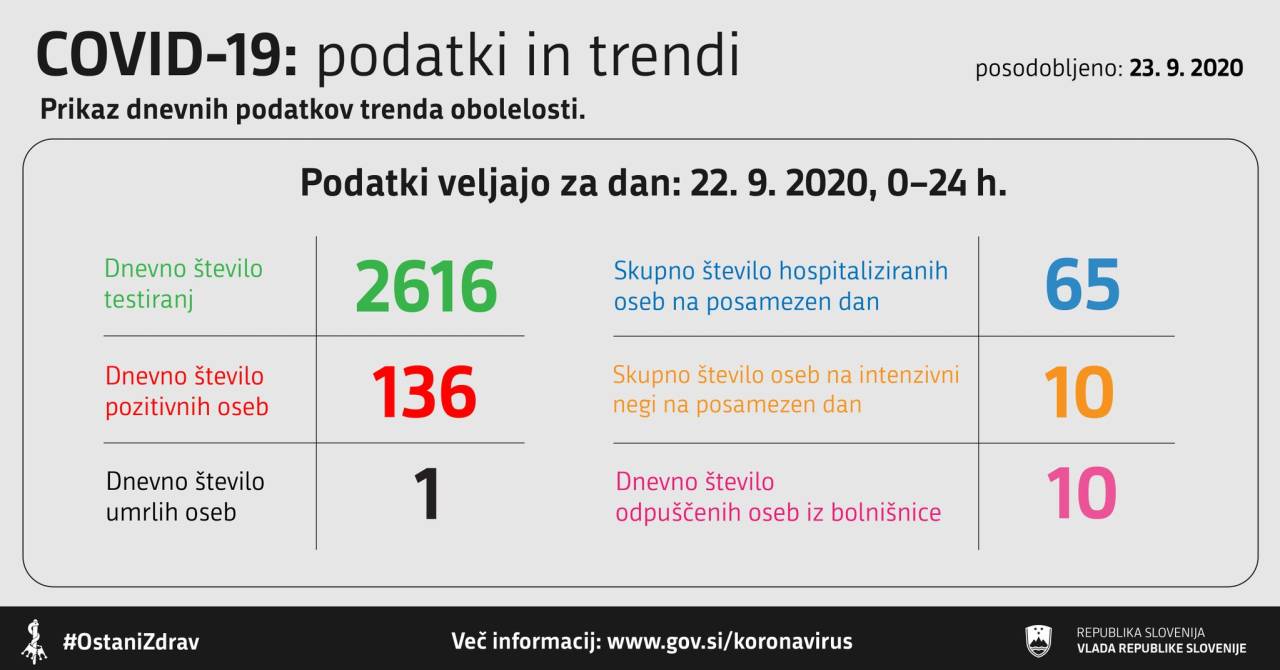 V Sloveniji so včeraj, 22. septembra, opravili 2616 testiranj na novi koronavirus. Potrdili so 136 novih okužb, kar je drugo največje dnevno število okužb.