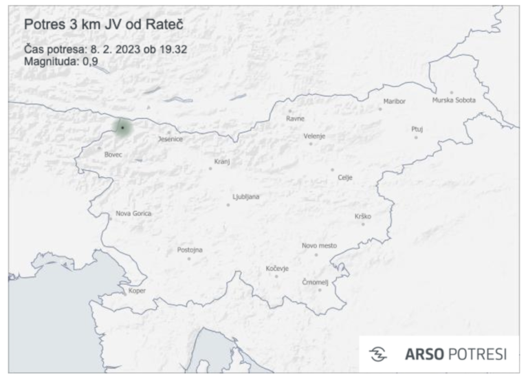 Seizmografi državne mreže potresnih opazovalnic so danes, ob 19.23, zabeležili potres magnitude 0,9 v bližini Rateč, 77 kilometrov severozahodno od Ljubljane.