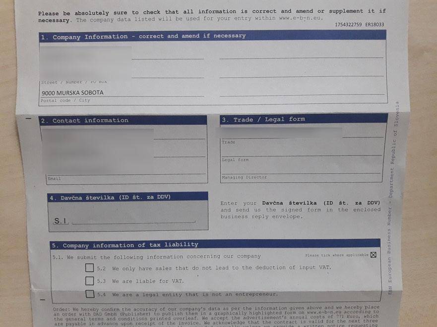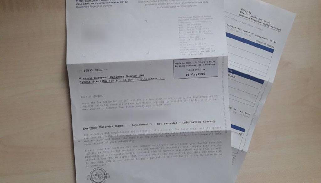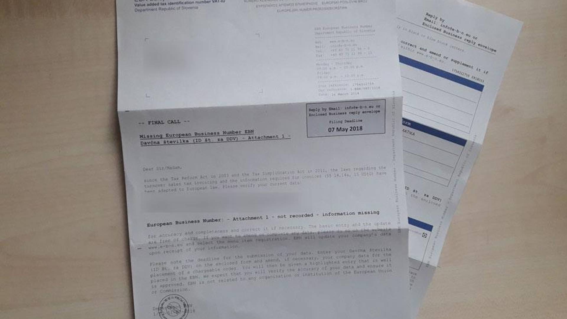 Prevaranti prejemnike pisem, pred katerimi smo svarili že pred časom, vabijo, da se prijavijo v brezplačno poslovno bazo in si tako zagotovijo evropsko poslovno številko, ki naj bi bila potrebna za podjetja v EU.