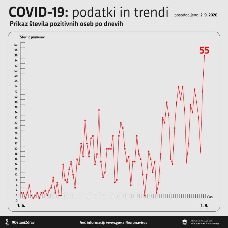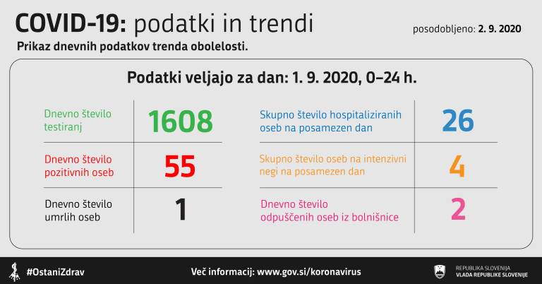 V Sloveniji so včeraj, 1. septembra, opravili 1608 testiranj na novi koronavirus. Potrdili so 55 novih okužb.