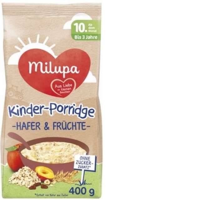- Porridge kašo z ovsom in sadjem (400 gramov) za otroke od desetega meseca do tretjega leta starosti proizvajalca Milupa.