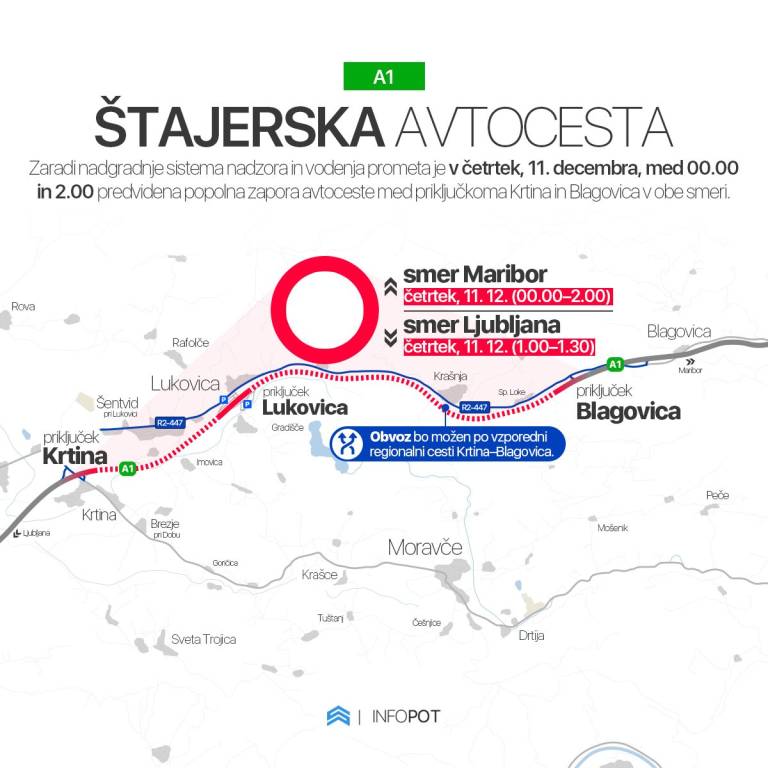 Na štajerski avtocesti bo v četrtek, 11. decembra, predvidena popolna zapora prometa med priključkoma Krtina in Blagovica v obe smeri.