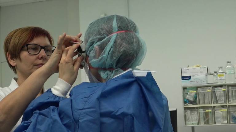 Osebna varovalna oprema se začne z razkuževanjem rok, nato se oseba obleče v zaščitni vodoodbojni plašč, na glavo pa si nadene zaščitno kapo. Maska, ki jo oseba nosi, je točno določena, nadeti pa si mora tudi zaščitna očala, ki tesnijo. Oprema se zaključi še z akrilnimi zaščitnimi rokavicami, ki so nekoliko podaljšane.