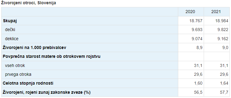 Po podatkih Statističnega urada Republike Slovenije se je leta 2021 v Sloveniji rodilo 18.984 otrok oziroma 217 več kot leto prej.