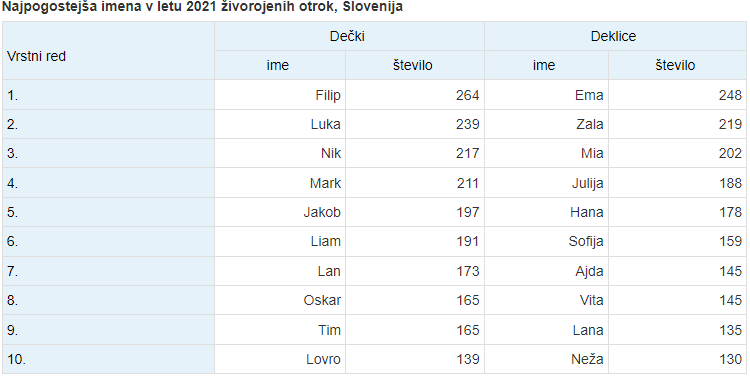 Po 22 zaporednih letih najbolj priljubljeno ime za dečke ni več Luka, ampak Filip. To ime so starši izbrali za 264 dečkov. Poleg teh dveh imen so bili pri novorojenčkih priljubljena imena še Nik, Mark in Jakob.