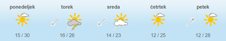 Sredi dneva bodo na severu krajevne plohe in nevihte, ki se bodo do večera razširile nad večji del države. Zapihal bo veter vzhodnih smeri, na Primorskem zvečer šibka do zmerna burja. Najnižje jutranje temperature bodo od 13 do 19, najvišje dnevne od 22 do 28, na Primorskem okoli 30 stopinj Celzija.