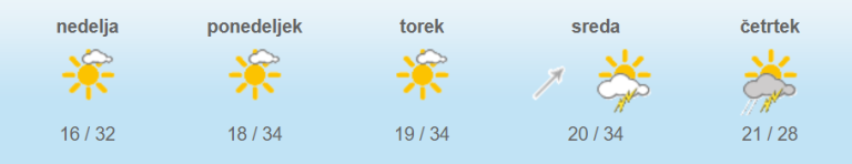 Temperature se bodo podnevi gibale od 29 do 33 stopinj Celzija, ponoči od 15 do 19 stopinj Celzija.