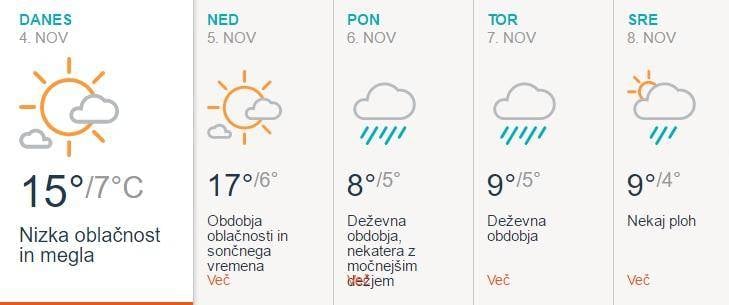 Ta konec tedna je verjetno še eden zadnjih lepih in razmeroma toplih vikendov v tem letu. Meteorologi za danes in jutri napovedujejo temperature celo do 17 stopinj Celzija, že v nedeljo pa bo pričelo ponekod v Sloveniji deževati. Padavine se bodo razširile tudi na Štajersko, temperature pa bodo občutno padle.