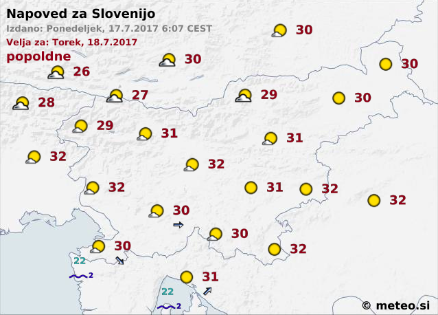 Danes bo sicer večinoma jasno. Najvišje dnevne temperature bodo od 24 do 29 stopinj Celzija. V torek, sredo in četrtek bo pretežno jasno in postopno spet bolj vroče.