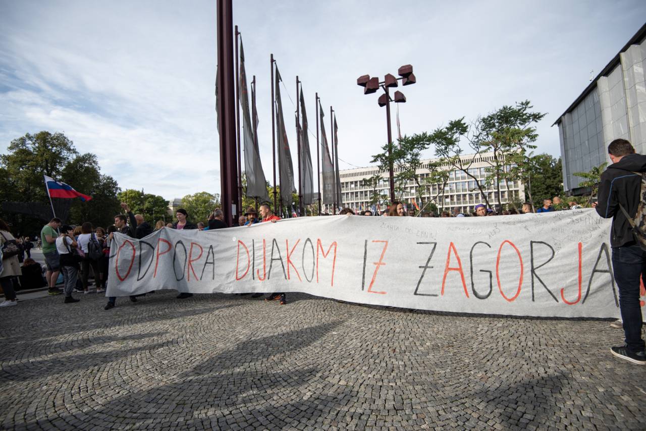 16.20 - Protestniki podpisujejo transparent »Podpora dijakom iz Zagorja.«