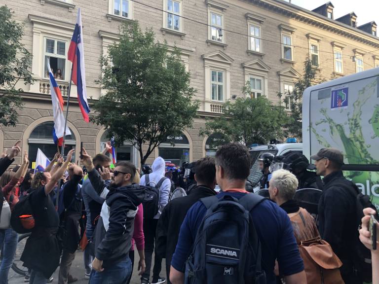 19.23 - Nekaj ljudi še protestira. Zaklenili so vrata Mlinarja in Špara na Čopovi ulici, saj se je v trgovini zatekalo preveč ljudi, ki so bežali pred solzivcem. Pred veleblagovnico Nama stoji policija v vodoravni vrsti.